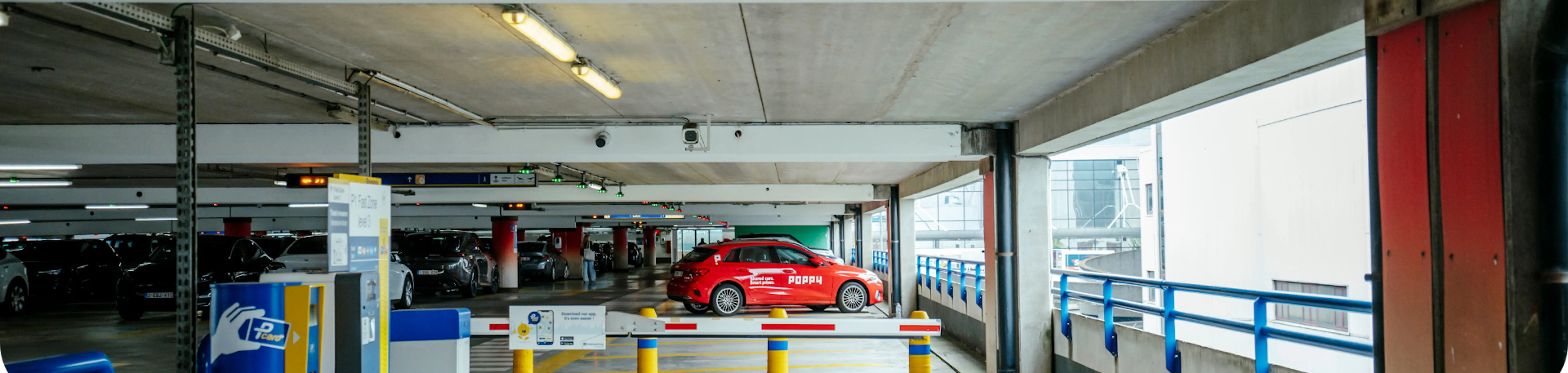 Entrez dans le parking "P1". Aucune carte de stationnement n'est nécessaire—nos barrières reconnaissent automatiquement les plaques d'immatriculation Poppy. Montez au "niveau 3", suivez les panneaux jaunes "Car Sharing" et garez-vous dans une place désignée pour le covoiturage. - Départ de l'aéroport de Zaventem